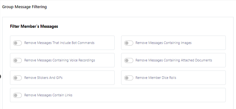 This section plays a pivotal role in group management, aiding in member organization and facilitating message filtering within your group. You have the ability to filter messages from group members using options such as `Filter Member`s Messages,` `Filter Forwarded Messages,` `Keyword Surveillance,` `Admin Filtered Messages,` `Service Messages,` `New Member Restrictions,` and `Member Message Limits`.