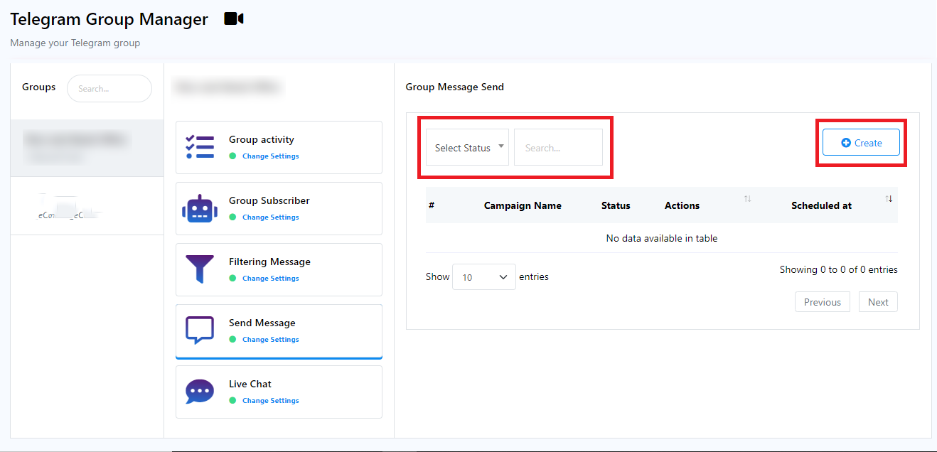 3. Additionally, you will find a `Create` button, which allows you to create a new message campaign template.